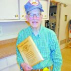 Retired Boy Scout volunteer Lester Smith is pictured smiling with the award plaque and the special engineer’s cap he was given at a Troop 260 Family Night.
