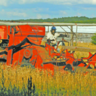 A Markowski farmhand maneuvers a big combine barely fitting under the wires of a shade tobacco field on Babb’s Road in mid-July.