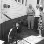 After the summer Sunday service on August 28, First Baptist Church President Ed Chase, center, tells Howard and Ann Orr about the Reverend Jesse Fowler Smith and his bicycle.