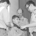 During the final step of Pack 266’s Blue and Gold Celebration, Webelos Cub Scout Reid Sunshine looks up patiently as three members of Boy Scout Troop 260 outfit him with a neophyte Boy Scout neckerchief.