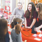 Rachel Tautic compresses the bellows to demonstrate the flexibility of the healthy lung replica hanging on the nearby frame.