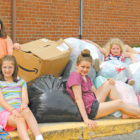 Elementary School PTO helpers relax a bit on the old clothes dropped off by over 20 families at the clothing drive held at Spaulding School on a beautiful spring Saturday.