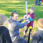 Coach Dan Blair instructs young Matthew Carney and other children in the Parks and Rec Tee-Ball Program.