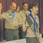 Troop 66’s newest Eagle Scout, Chris Ferraina, recites the Eagle Scout promise with M. C. Jim Works, a former Troop leader who traveled from Florida for the May 13 event at West Suffield Congregational Church.