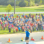Matt Bourgoin, the physical education teacher at Spaulding School, leads the excited Spaulding School community in an exercise during the All Children Exercise Simultaneously event held in early May.