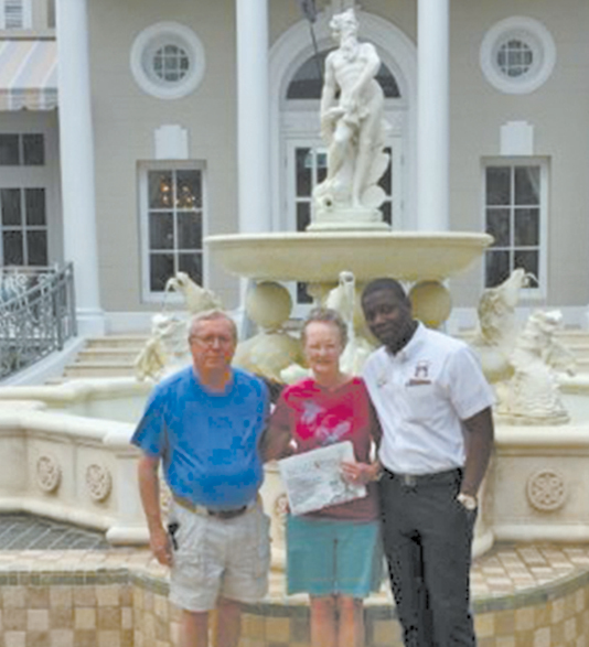 Ralph and Donna Garside pose with the Observer and their butler by the ornate fountain at the Sandals Royal Bahamian in Nassau. Nice digs!