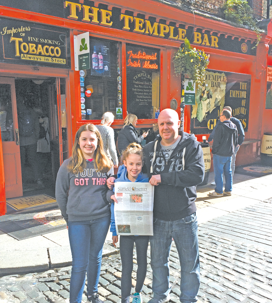 Pictured in front of the old Temple Bar in Dublin, Wayne Keegan and his daughters, Elizabeth and Olivia, are enjoying their visit to Ireland. That’s Elizabeth holding the Observer.