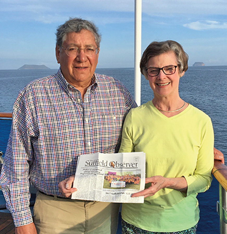 The turtles and other unique beasts didn’t want to pose, so Luis and Heather Lee set up this Where-In-The-World photo with the Observer at the rail of their boat during a cruise in the Galopagos Islands at the end of April. Both are Observer volunteers.