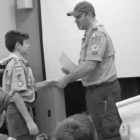 Life Scout Sam Sikes of Boy Scout Troop 260 receives the Corporal Stephen R. Bixler Award from Scoutmaster Mike Cremins at a Family Night June 6.