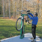 A Bloomfield cyclist uses the new do-it-yourself repair station at Suffield’s rail trail parking lot.