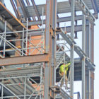 A construction worker completes a joint on scaffolding high up in a five-floor stair tower of the new Memorial Hall at Suffield Academy. The main frame of the steelwork was completed in October.
