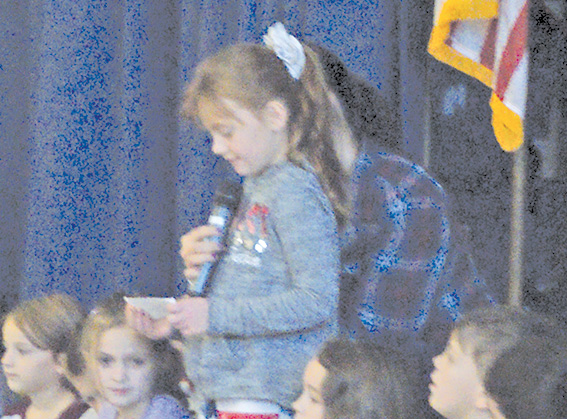 Second Grader Teagan Arnold reads a quote from author-journalist Lance Morrow during Spaulding School’s program for the children’s invited veteran guests on November 9. That’s her teacher’s hand holding the mike.
