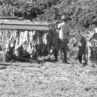 Farmhands load a few more lath on the rack, to be hauled off to be hung. On August 30, the Nowak farm crew had nearly finished cutting the broadleaf on the Mountain Road field west of the Goodyear greenhouses.