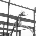 High up on their man-lift, two steel erectors from PDS Engineering Design and Construction bolt another roof beam to its post.