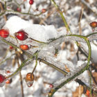 Encapsulated berries sparkle in the sunlight on a snow covered tree limb.