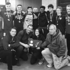 Pictured in New Haven after the CIAC Class M state meet, Joe Somecrop, center right, helps the SHS boys indoor track team celebrate many individual victories and their award plaque for placing second overall.