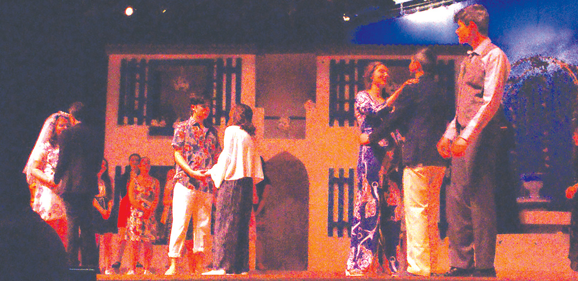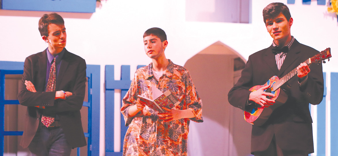 The impressive set, in addition to the projected Mediterranean sky backdrop, included a large, two-story tavern, an ingenious, smoothly rotating house for exterior and interior scenes, and a decorative water fountain, actually flowing. All this was the result of talented design work by Mike Grigoriou and the impressive efforts of the big construction and backstage crew, led by technical director, master carpenter, and science teacher Joe Grimard. Other creative leadership was provided by artistic director Stephanie Holland, music director Mary DiRoberts, assistant director Lisa Muscarella, choreographer Kelly Blais, and costume mistress Lori Foss.