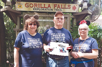 Extending publicity for Suffield’s 350th anniversary to potential visitors from Disney World, this Suffield trio pauses for a photo with the Observer before setting out for a hike on the Gorilla Falls Exploration Trail in Africa. From the left: Gerri Moodie with Bob and Chris Anderson.