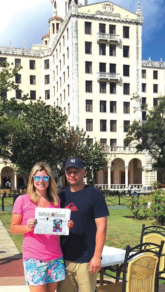 Rachelle Kowal holds the Observer for a photograph in one of the harborside gardens of the Hotel de National de Cuba. She and Chris visited Cuba in April.