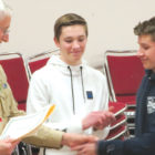 Troop 260 Assistant Scoutmaster Art Sikes, Jr., offers a traditional left-handed handshake to his grandson, Sam Sikes, this year’s winner of the troop’s Arthur Sikes, Sr., Summer Adventure Award.