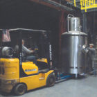 The forklift operator inches forward to set the processing tank down just right, guided by Eric Mance, by the tank.