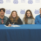 In the main corridor at SHS on October 10, soccer star Katie Davis, with pen, is poised to sign her agreement to play soccer for Case Western Reserve University, where she has been offered a scholarship.