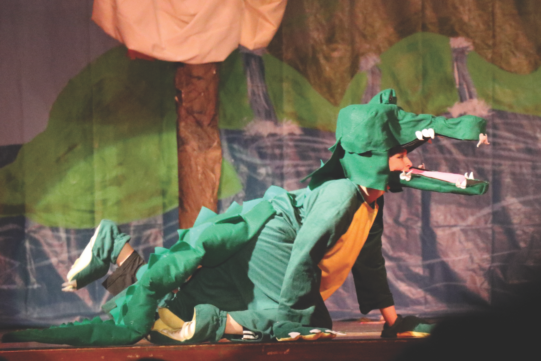 Peter Pan was played by Claire Halasi-Kun, who was wonderfully expressive in the role as Peter persuaded the Darling children to fly with him to Neverland in search of his lost shadow. There they were tussled with the pirate crew of Captain Hook (scoundrelly portrayed by Jackson Dapo) and helped the Brave Girls save the Lost Boys of Neverland. The audience was particularly impressed with Tiger Lily, the Brave Girls’ leader (Annika Gustafson), and enjoyed the loyal presence of Nana, the Darling family dog (Devon Root-Blanchfield). And they laughed at the antics of the Neverland Crocodile (Quinn Boudreau).