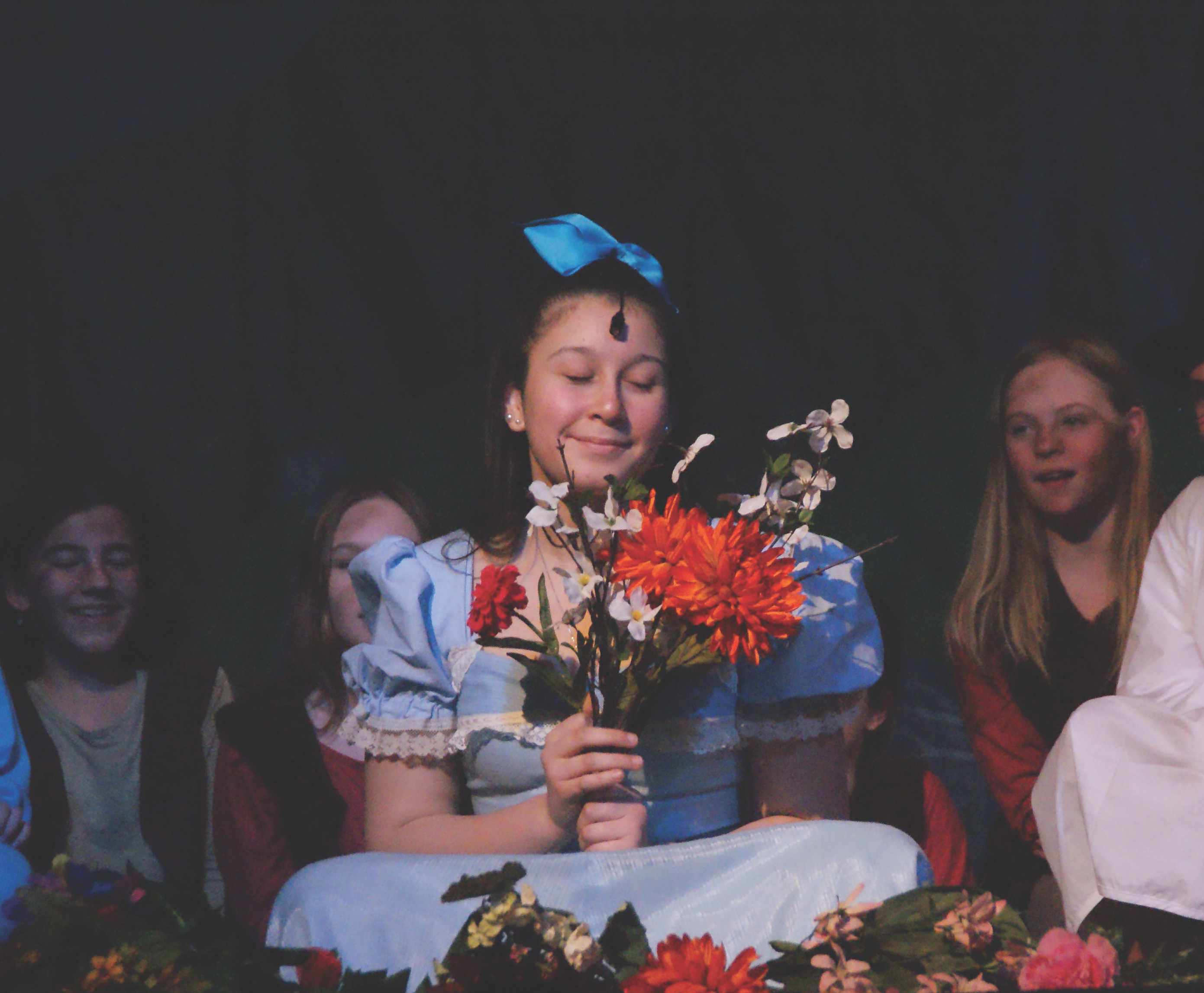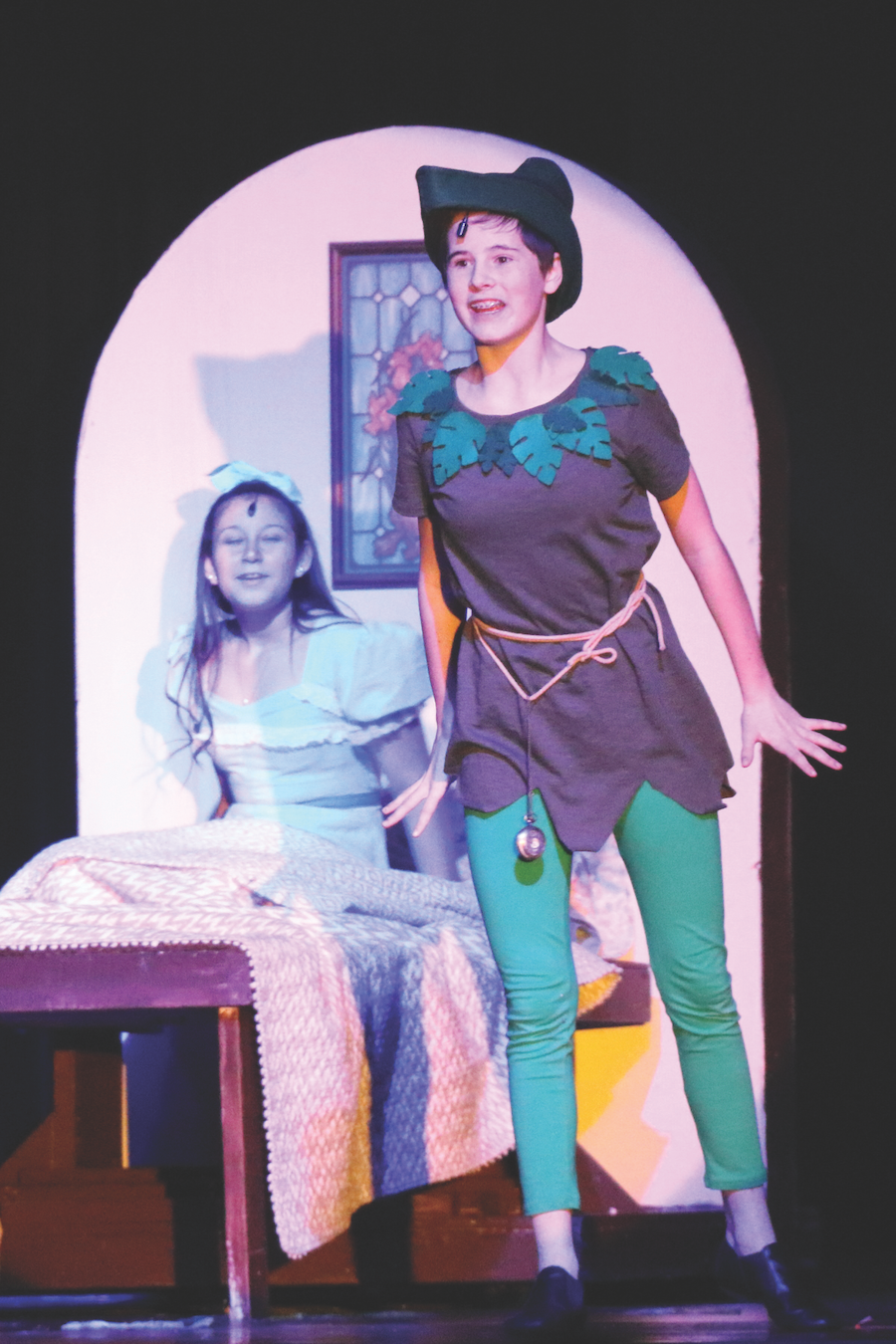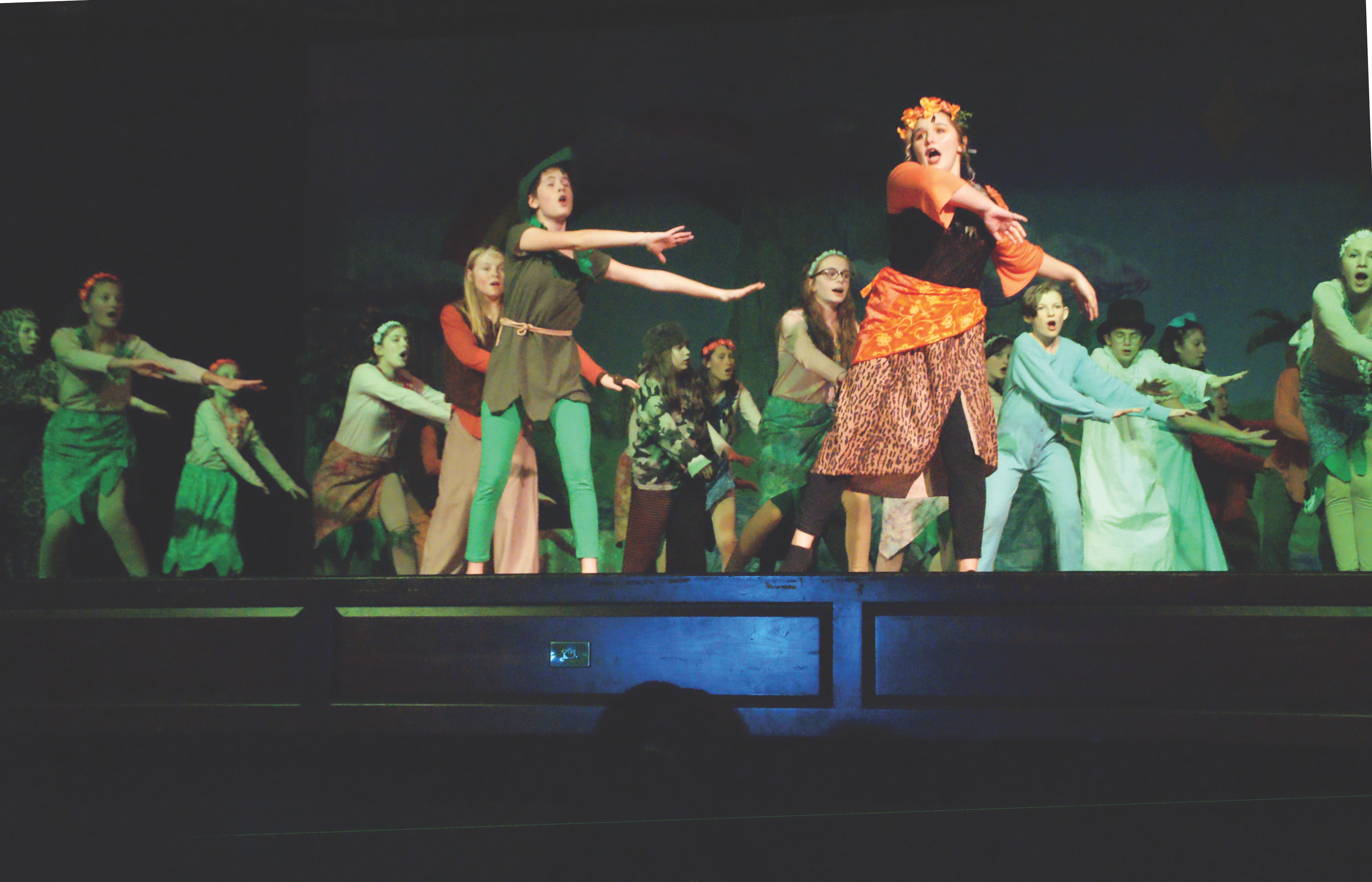 An entertaining bit of stage action was the quite non-injurious sword fight between Captain Hook and his first mate Snee (Nick Dery), an adversary pair dramatically mismatched in size (as middle schoolers often are). An impressive performance was provided by a participant not listed with the cast. Tinker Bell, Peter Pan’s mischievous fairy sidekick, was represented by a bright spot of laser light dancing lightly around on the set under the skillful control of Mahi Relekar, a black-clad member of the light and sound crew. She performed crouching in the dark below the edge of the stage. Nice work, Mahi.