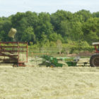 The tractor driver looks back to see that the spring hay crop in Elzear Roy’s field on Mountain Road is being properly baled. Earlier in the day, the crop had been raked into rows.