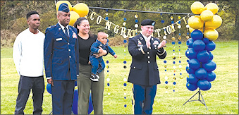 Pictured in the photo (Left to right) are Kevin’s son, Marine Corp Corporal Hezekiah Molligan, Kevin, wife Nathaly holding son Nathan and Lieutenant Colonel Steven MacSweeney who conducted the ceremony.