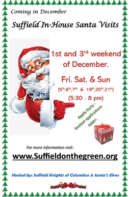 The North Pole has confirmed that Santa will be visiting Suffield during the first and third weekends of December, from December 5 – 7 and December 19 – 21. Santa will visit between 5:30 p.m. to 8 p.m. on both weekends. If you are interested in arranging a visit, please fill out the form that is posted @ www.Suffieldonthegreen.org/Santa.