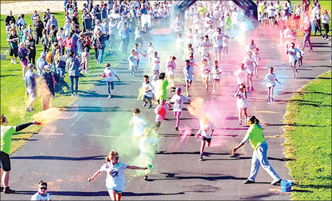 Students run through clouds of color dust (biodegradable, non-toxic) being thrown by high school and parent volunteers.