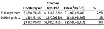 Of the 169 municipalities in Connecticut, 23 get more state aid than what their citizens pay in income taxes while the remaining 146 get less, as follows: