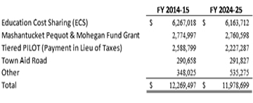 This reduction in state aid, coupled with rising expenses, has resulted in a larger burden on local property taxpayers to fund the Town government (68% in FY 2024-25 compared to 65% in FY 2014-15 and, going back further, 61% in 1999-00).