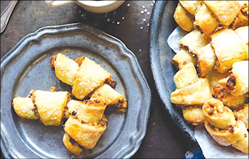 Brush the rugelach with milk or cream; and sprinkle with granulated or coarse sparkling sugar.