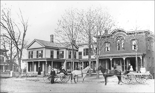 Suffield Center Store front about 1880. From left to right- Mrs. Mary Jane Thompson, Mrs. Sackett, Leverett Sackett (in front of wagon), Hiram Jones and Zella Sackett in wagon and Edward Perkins and Emily Sackett in wagon. Horace D. Sackett store – then Martinez, until taken down in 1968. Delphia H. Clark photo collection, KML