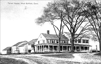 The building shown was built in 3 sections, the oldest and smallest facing Mountain Road was built as early as 1718, but for sure by 1728, it was removed in 1960. It had many owners. The 1855 Suffield Map just called it “Hotel”. The 1869 Suffield map called it “Gruendler Hotel”. In 1869 it was sold to Benjamin Franklin Terrett.