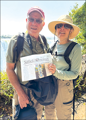Karen Jason and Rick Kirschbaum with the Observer at Victoria Falls, Zambia.