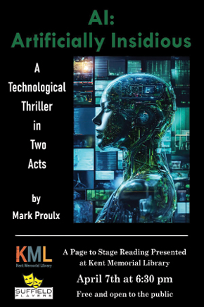 The Suffield Players will present a staged reading of AI: Artificially Insidious, a technological thriller in two acts written and directed by Agawam, Massachusetts playwright Mark Proulx, on Monday, April 7 at 6:30 p.m. at Kent Memorial Library, 50 North Main Street in Suffield. The event is free and open to the public.