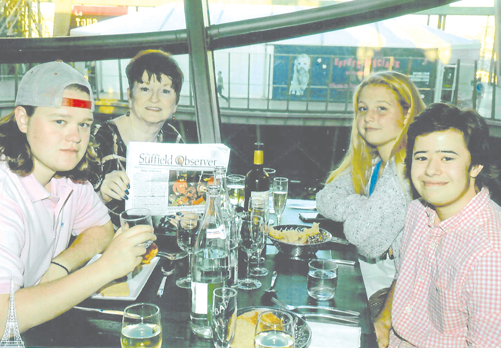 On a recent trip to London and Paris, Kathy Krar (holding the Observer) is pictured with her grandchildren (from the left) Nicholas Mayo, Bella Nutini, and Zachary Krar. They’re dining in the Eiffel Tower’s restaurant, part way up to the top.