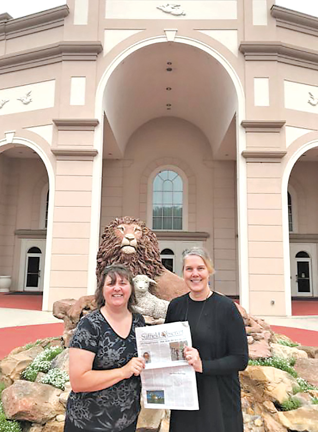 Irene Beresford Clark and Lynn Joyal pose with The Suffield Observer in front of the Sight & Sound Theater in Lancaster County, Penn. They were waiting with the lion and the lamb to see the production called JESUS. Sight & Sound produces extravagant musical presentations of Bible stories in a 2,000-seat theater with a 300-foot wrap-around stage and impressive audio and visual effects.