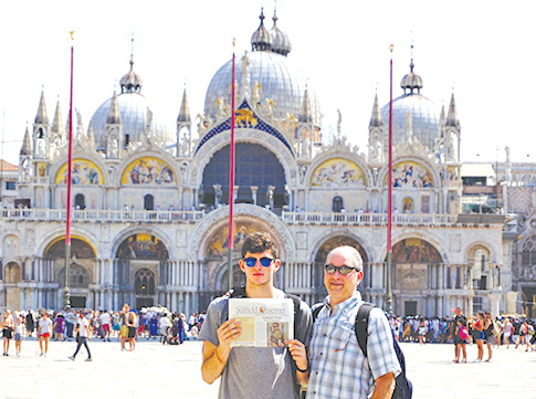 Nick Sinofsky holds the peripatetic Observer, standing with his father, Darren, in front of St. Mark’s Basilica in July. The visit to Venice was a stop on their tour of Northern Italy.