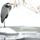 An unusual sight – a Great Blue Heron perches on a snowy rock in the Farmington River in Simsbury.