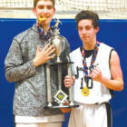 Pictured are Suffield High students Evan Craig and Matt Emma displaying their first place trophy and medals after winning the Division II Super Regional Championship with their AAU basketball team,