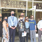 SMS Vice Principal Dianna Kolodziey, French teacher and Convener Devlyn Bent, Superintentent Tim Van Tasel, family members David Graveen, Ilana Stollman and Sacha Nelson (who received a Certificate of Merit) and SMS Principal Ken Smith join last year’s 6th grade State Scholastic Challenge winner Soren Nelson (front) at the presentation of his long-awaited trophy.