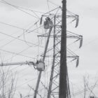 Four linemen in two high-lift bucket trucks install interconnecting loops on the electrical cables of one of the old lattice towers in preparation for transferring the cables to one of the new monopole towers close by at this corner just east of North Stone Street.