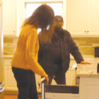 Agent Brenda Nuhfer demonstrates the microwave oven to builder Elzear Roy, who dropped in during open house time at his Olde Creamery Village condo apartments on a rainy March Sunday afternoon.